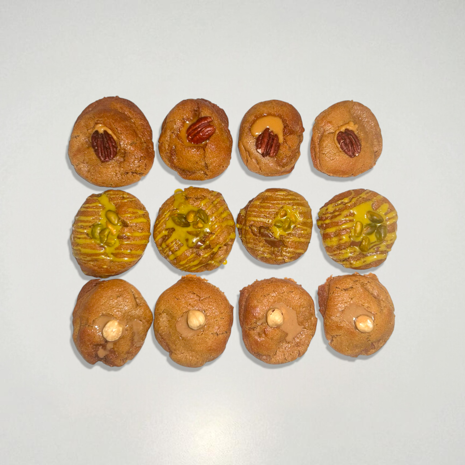 Votre boîte de 12 mini cookies croquants est composée de : 4 aux noix de pécan et caramel beurre salé maison, 4 à la pistache et chocolat au lait (crème pistache maison) et 4 aux noisettes et crème Bueno maison.