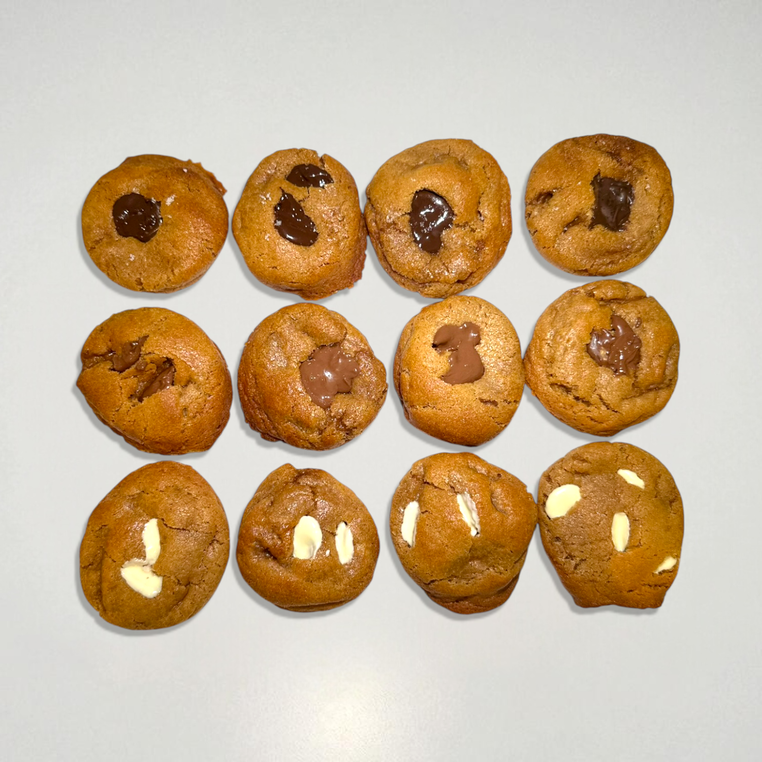 Votre boîte de 12 mini cookies au chocolat est composée de : 4 au chocolat au lait, 4 au chocolat blanc et 4 au chocolat noir et fleur de sel.